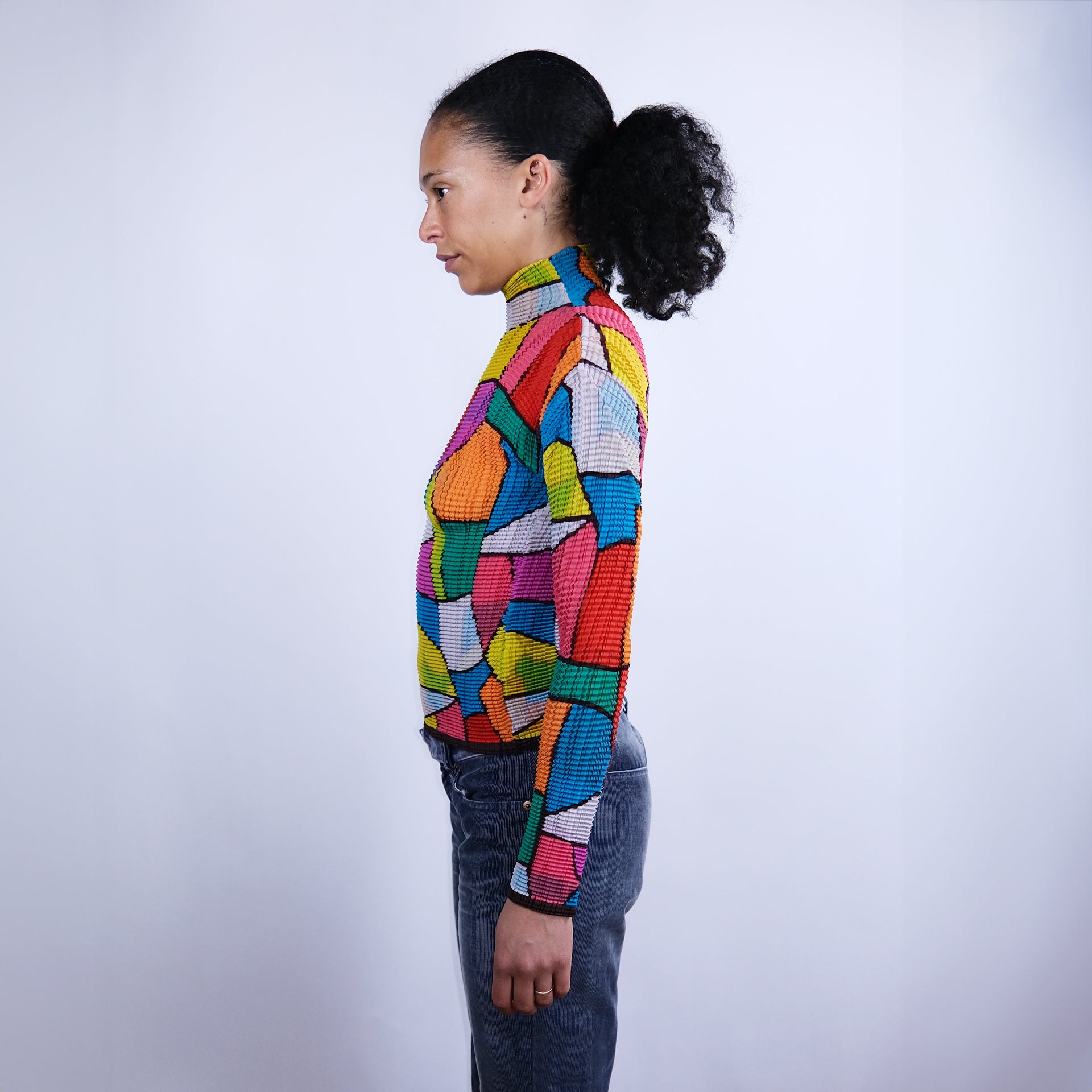 00's Issey Miyake Pleated Longsleeve Top in Multicolour Tile Print - Size 3